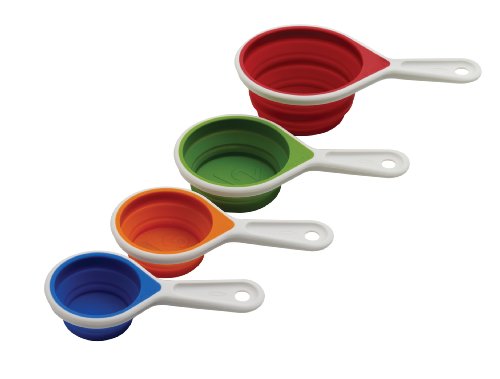Definitely not grandma’s measuring cups. Every member of the SleekStor 4-piece measuring cup set expands for quick use and then contracts for easy storage. Includes a handy storage clip. Four sizes; 1 cup, 1/2 cup, 1/3 cup and 1/4 cup sizes. Cups not for use in microwave, however they are top rack dishwasher safe. Core multicolored color scheme includes the following colors: Pacific, Apricot, Arugula and Cherry. By Chef'n.