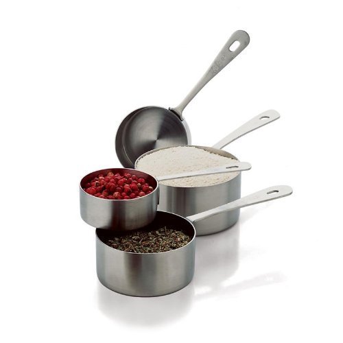 Professional Performance Measuring cups are fashioned of heavy gauge top quality 18/8 stainless steel, and engineered for precision accuracy to assure consistency in food preparation time and time again. This set of 4 measuring cups includes the most commonly called-for measurements -- 1 cup, 1/2 cup, 1/3 cup, and 1/4 cup. The handle is imprinted with the measurement and is pierced to hang for storage. Handle and bowl are constructed of a solid piece of metal -- no seams or welds to break or harbor bacteria.